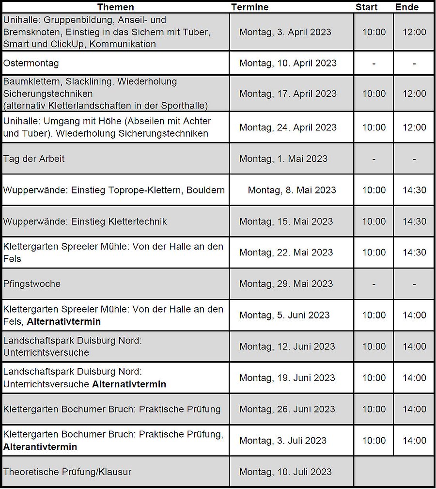 Für die Termine, die draußen stattfinden werden, ist für den Fall schlechten Wetters ein Alternativtermin angegeben. Von diesen zwei Terminen findet jeweils nur einer statt. Sollte der erste der beiden Termine stattfinden, werden alle folgenden Termine ein Woche vorgezogen (siehe Zeitplan unten).