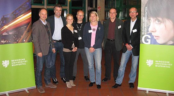 Den Auftakt der DHB-Fachleiter-Tagung bildete eine Podiumsdiskussion mit (von links): Jens Pfänder (DHB-Lehrwart), Heiner Brand (DHB-Manager), Julia Kethorn (Studentin Uni Wuppertal), Torsten Kleine (Dozent Uni Wuppertal), Stefanie Osenberg (Bayer Leverkusen), Bernd Henning (Studienseminar Neuss), Prof. Dr. Detlef Kuhlmann (Uni Hannover). Foto: Uni Wuppertal.