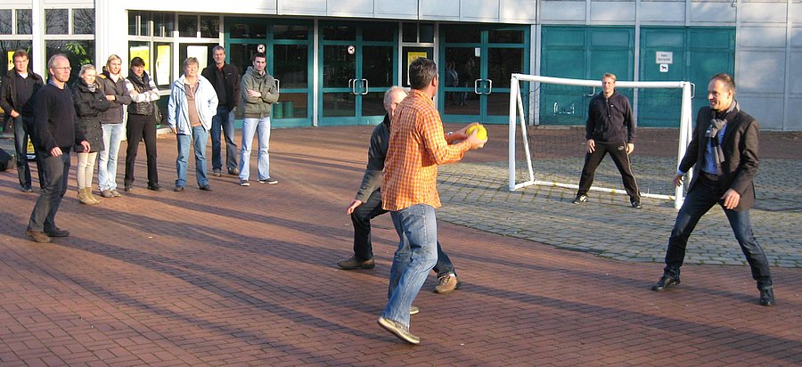 Praktischer Abschluss der DHB-Fachleiter-Tagung: eine kurze Street-Handball-Demonstration mit DHB-Lehrwart Jens Pfänder (rechts) Foto: Schimpf.